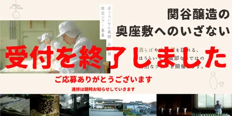 受付終了のご連絡です この度募集させていただいだ、ほうらいせん蔵部限定のイベント「関谷醸造の奥座敷へのいざない」は募集人数に達しましたので受付を終了させていただきました。 ご応募いただいた皆様、ありがとうございます。ここからも皆様のアイデアを持ち寄り検討していくことがございます。